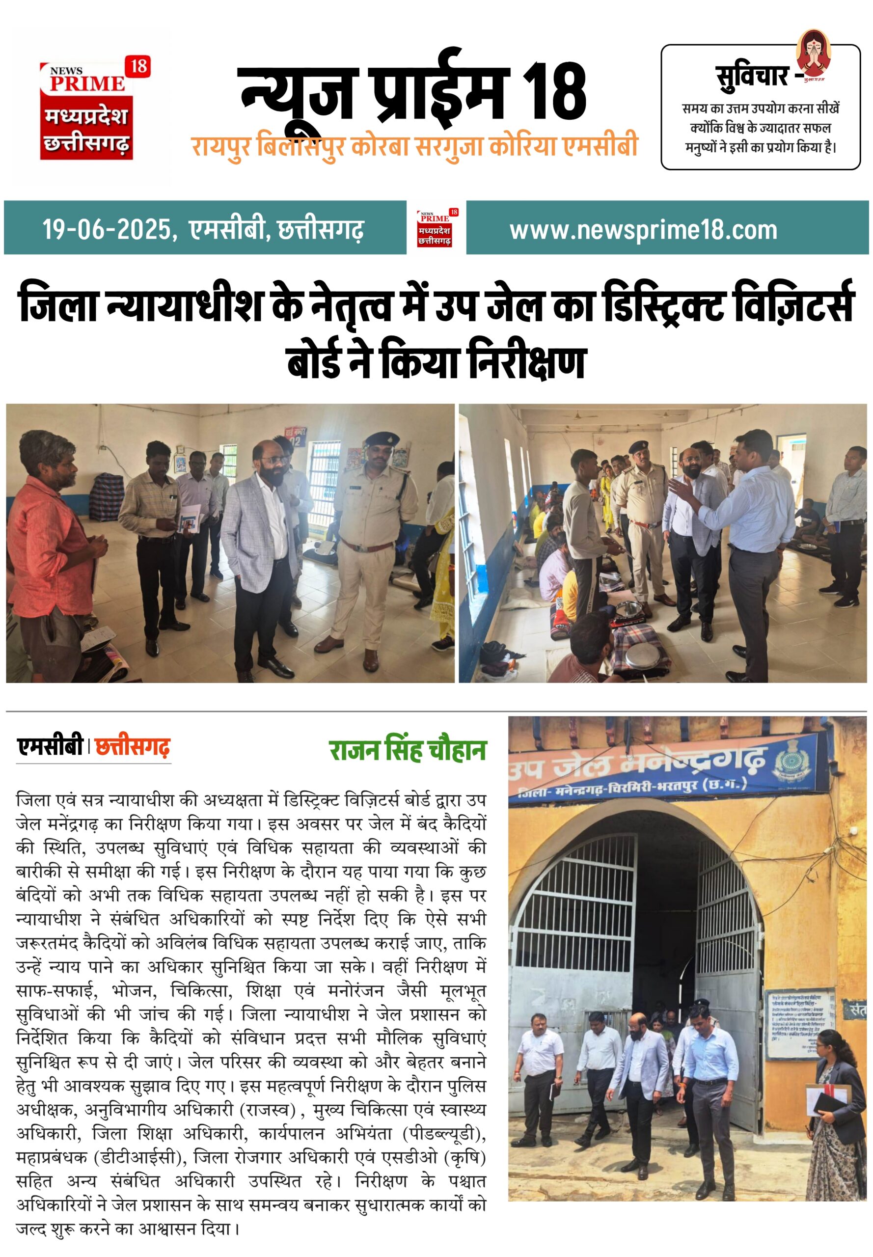एमसीबी।जिला एवं सत्र न्यायाधीश की अध्यक्षता में डिस्ट्रिक्ट विज़िटर्स बोर्ड द्वारा उप जेल मनेंद्रगढ़ का निरीक्षण किया गया। इस अवसर पर जेल में बंद कैदियों की स्थिति, उपलब्ध सुविधाएं एवं विधिक सहायता की व्यवस्थाओं की बारीकी से समीक्षा की गई। इस निरीक्षण के दौरान यह पाया गया कि कुछ बंदियों को अभी तक विधिक सहायता उपलब्ध नहीं हो सकी है। इस पर न्यायाधीश ने संबंधित अधिकारियों को स्पष्ट निर्देश दिए कि ऐसे सभी जरूरतमंद कैदियों को अविलंब विधिक सहायता उपलब्ध कराई जाए, ताकि उन्हें न्याय पाने का अधिकार सुनिश्चित किया जा सके। वहीं निरीक्षण में साफ-सफाई, भोजन, चिकित्सा, शिक्षा एवं मनोरंजन जैसी मूलभूत सुविधाओं की भी जांच की गई।