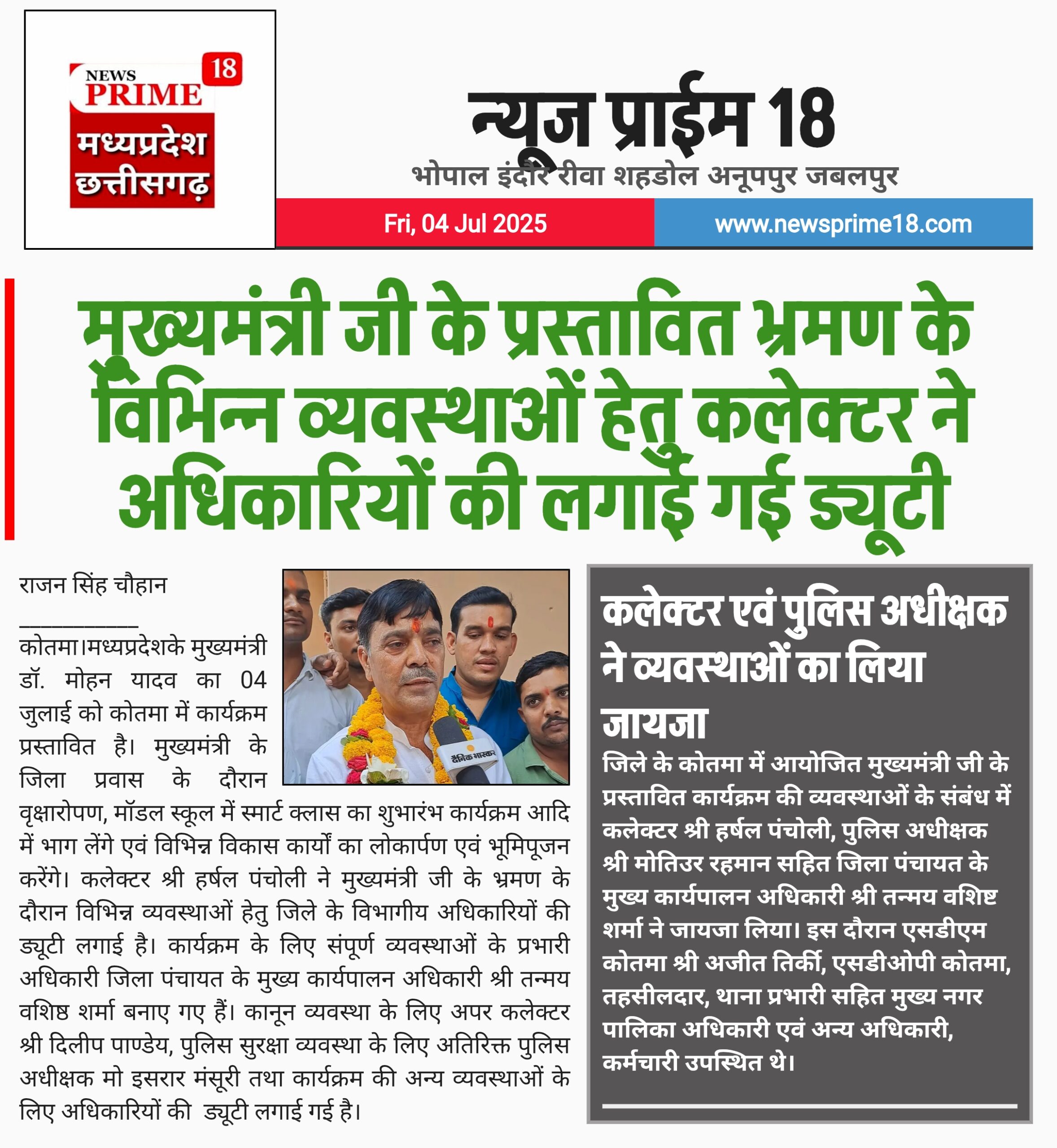 अनुपपुर कोतमा। मध्यप्रदेश के मुख्यमंत्री डॉ. मोहन यादव का 04 जुलाई को कोतमा में कार्यक्रम प्रस्तावित है। मुख्यमंत्री के जिला प्रवास के दौरान वृक्षारोपण, मॉडल स्कूल में स्मार्ट क्लास का शुभारंभ कार्यक्रम आदि में भाग लेंगे एवं विभिन्न विकास कार्यों का लोकार्पण एवं भूमिपूजन करेंगे। कलेक्टर श्री हर्षल पंचोली ने मुख्यमंत्री जी के भ्रमण के दौरान विभिन्न व्यवस्थाओं हेतु जिले के विभागीय अधिकारियों की ड्यूटी लगाई है। कार्यक्रम के लिए संपूर्ण व्यवस्थाओं के प्रभारी अधिकारी जिला पंचायत के मुख्य कार्यपालन अधिकारी श्री तन्मय वशिष्ठ शर्मा बनाए गए हैं। कानून व्यवस्था के लिए अपर कलेक्टर श्री दिलीप पाण्डेय, पुलिस सुरक्षा व्यवस्था के लिए अतिरिक्त पुलिस अधीक्षक मो इसरार मंसूरी तथा कार्यक्रम की अन्य व्यवस्थाओं के लिए अधिकारियों की ड्यूटी लगाई गई है।