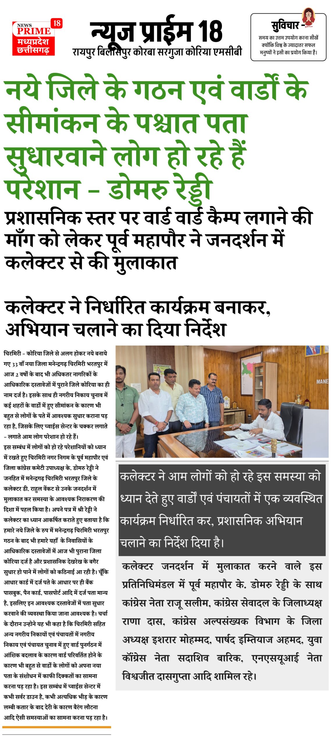 इस सम्बंध में लोगों को हो रहे परेशानियों को ध्यान में रखते हुए चिरमिरी नगर निगम के पूर्व महापौर एवं जिला कांग्रेस कमेटी उपाध्यक्ष के. डोमरु रेड्डी ने जनहित में मनेन्द्रगढ़ चिरमिरी भरतपुर जिले के कलेक्टर डी. राहुल वेंकट से उनके जनदर्शन में मुलाकात कर समस्या के आवश्यक निराकरण की दिशा में पहल किया है। अपने पत्र में श्री रेड्डी ने कलेक्टर का ध्यान आकर्षित कराते हुए बताया है कि हमारे नये जिले के रुप में मनेन्द्रगढ़ चिरमिरी भरतपुर गठन के बाद भी हमारे यहाँ के निवासियों के आधिकारिक दस्तावेजों में आज भी पुराना जिला कोरिया दर्ज है और प्रशासनिक देखरेख के बगैर सुधार हो पाने में लोगों को कठिनाई आ रही है। चूँकि आधार कार्ड में दर्ज पते के आधार पर ही बैंक पासबुक, पैन कार्ड, पासपोर्ट आदि में दर्ज पता मान्य है, इसलिए इन आवश्यक दस्तावेजों में पता सुधार करवाने की व्यवस्था किया जाना आवश्यक है। चर्चा के दौरान उन्होने यह भी कहा है कि चिरमिरी सहित अन्य नगरीय निकायों एवं पंचायतों में नगरीय निकाय एवं पंचायत चुनाव में हुए वार्ड पुनर्गठन में आंशिक बदलाव के कारण वार्ड परिवर्तित होने के कारण भी बहुत से वार्डों के लोगों को अपना नया पता के संशोधन में काफी दिक्कतों का सामना करना पड़ रहा है। इस सम्बंध में च्वाईस सेन्टर में कभी सर्वर डाउन है, कभी अत्यधिक भीड़ के कारण लम्बी कतार के बाद देरी के कारण बैरंग लौटना आदि ऐसी समस्याओं का सामना करना पड़ रहा है।कलेक्टर ने आम लोगों को हो रहे इस समस्या को ध्यान देते हुए वार्डों एवं पंचायतों में एक व्यवस्थित कार्यक्रम निर्धारित कर, प्रशासनिक अभियान चलाने का निर्देश दिया है। कलेक्टर जनदर्शन में मुलाकात करने वाले इस प्रतिनिधिमंडल में पूर्व महापौर के. डोमरु रेड्डी के साथ कांग्रेस नेता राजू सलीम, कांग्रेस सेवादल के जिलाध्यक्ष राणा दास, कांग्रेस अल्पसंख्यक विभाग के जिला अध्यक्ष इशरार मोहम्मद, पार्षद इम्तियाज अहमद, युवा कॉंग्रेस नेता सदाशिव बारिक, एनएसयूआई नेता विश्वजीत दासगुप्ता आदि शामिल रहे।