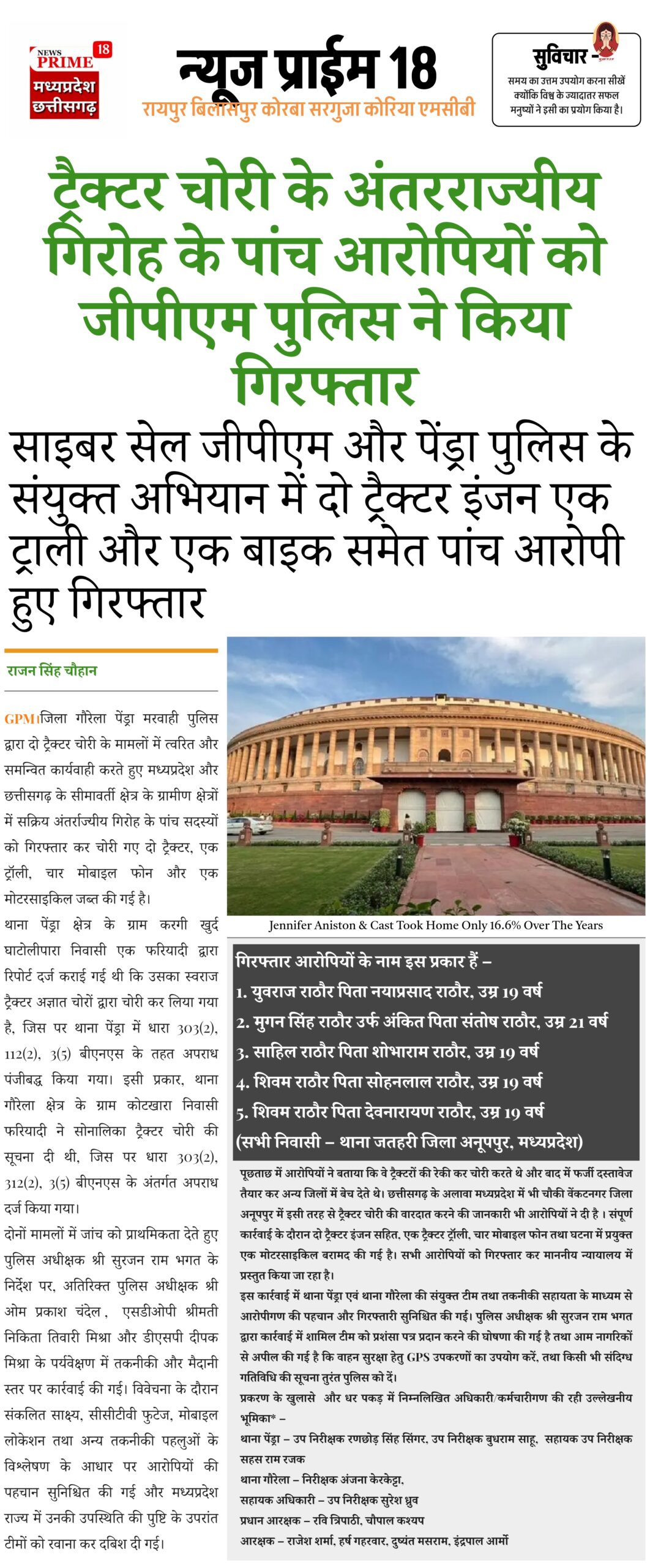ट्रैक्टर चोरी के अंतरराज्यीय गिरोह के पांच आरोपियों को जीपीएम पुलिस ने किया गिरफ्तार
