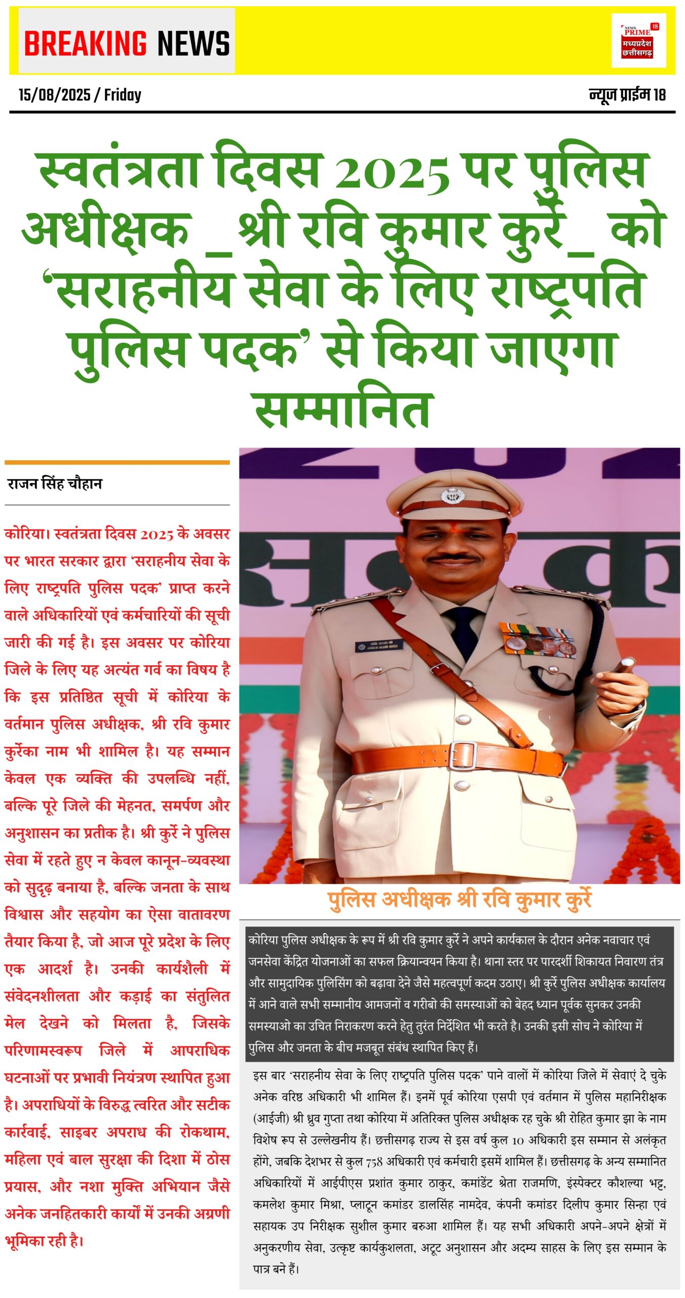 कोरिया। स्वतंत्रता दिवस 2025 के अवसर पर भारत सरकार द्वारा ‘सराहनीय सेवा के लिए राष्ट्रपति पुलिस पदक’ प्राप्त करने वाले अधिकारियों एवं कर्मचारियों की सूची जारी की गई है। इस अवसर पर कोरिया जिले के लिए यह अत्यंत गर्व का विषय है कि इस प्रतिष्ठित सूची में *कोरिया के वर्तमान पुलिस अधीक्षक, श्री रवि कुमार कुर्रे* का नाम भी शामिल है। यह सम्मान केवल एक व्यक्ति की उपलब्धि नहीं, बल्कि पूरे जिले की मेहनत, समर्पण और अनुशासन का प्रतीक है। श्री कुर्रे ने पुलिस सेवा में रहते हुए न केवल कानून-व्यवस्था को सुदृढ़ बनाया है, बल्कि जनता के साथ विश्वास और सहयोग का ऐसा वातावरण तैयार किया है, जो आज पूरे प्रदेश के लिए एक आदर्श है। उनकी कार्यशैली में संवेदनशीलता और कड़ाई का संतुलित मेल देखने को मिलता है, जिसके परिणामस्वरूप जिले में आपराधिक घटनाओं पर प्रभावी नियंत्रण स्थापित हुआ है। अपराधियों के विरुद्ध त्वरित और सटीक कार्रवाई, साइबर अपराध की रोकथाम, महिला एवं बाल सुरक्षा की दिशा में ठोस प्रयास, और नशा मुक्ति अभियान जैसे अनेक जनहितकारी कार्यों में उनकी अग्रणी भूमिका रही है।