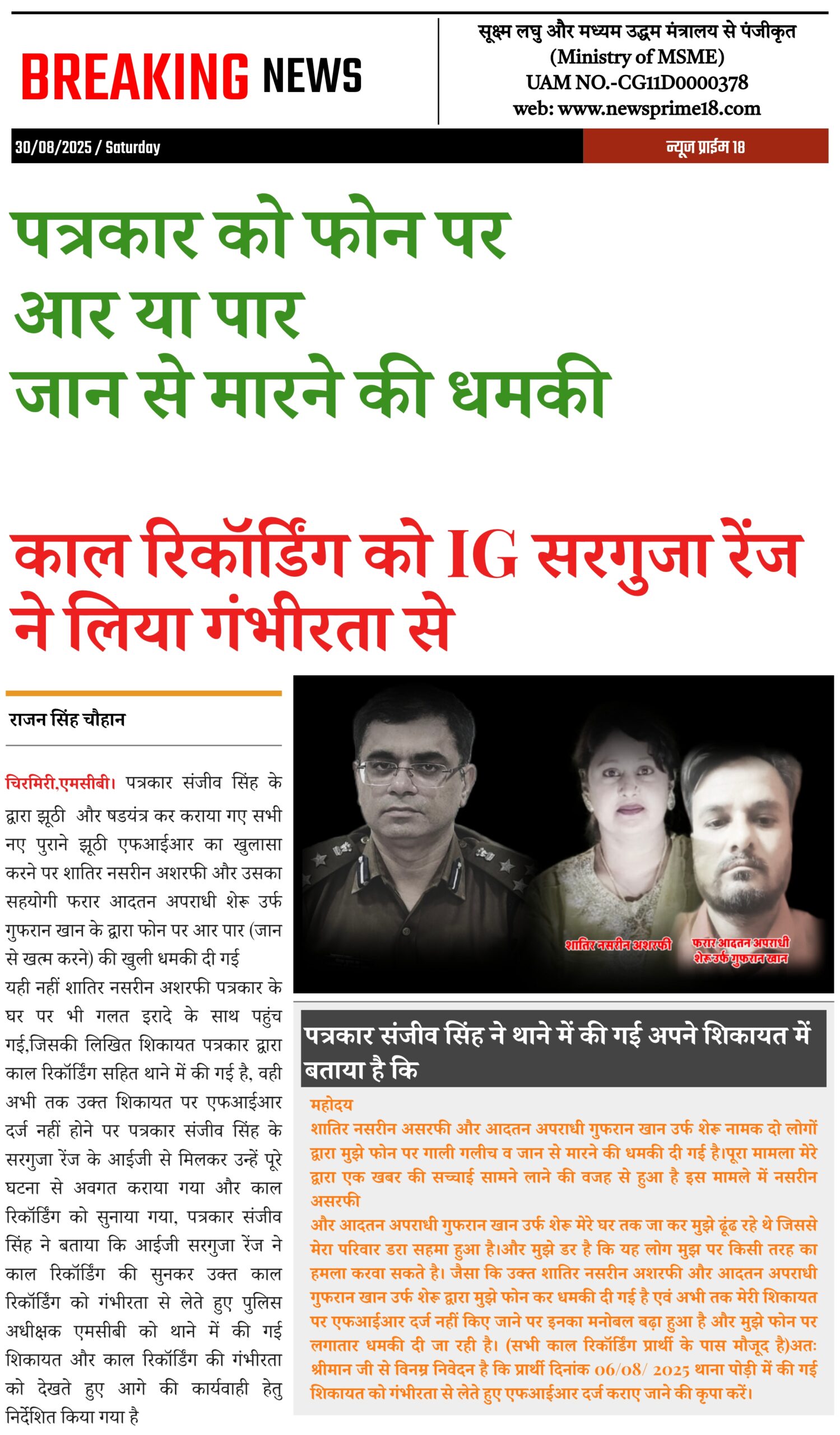 चिरमिरी,एमसीबी। पत्रकार संजीव सिंह के द्वारा झूठी और षडयंत्र कर कराया गए सभी नए पुराने झूठी एफआईआर का खुलासा करने पर शातिर नसरीन अशरफी और उसका सहयोगी फरार आदतन अपराधी शेरू उर्फ गुफरान खान के द्वारा फोन पर आर पार (जान से खत्म करने) की खुली धमकी दी गई।