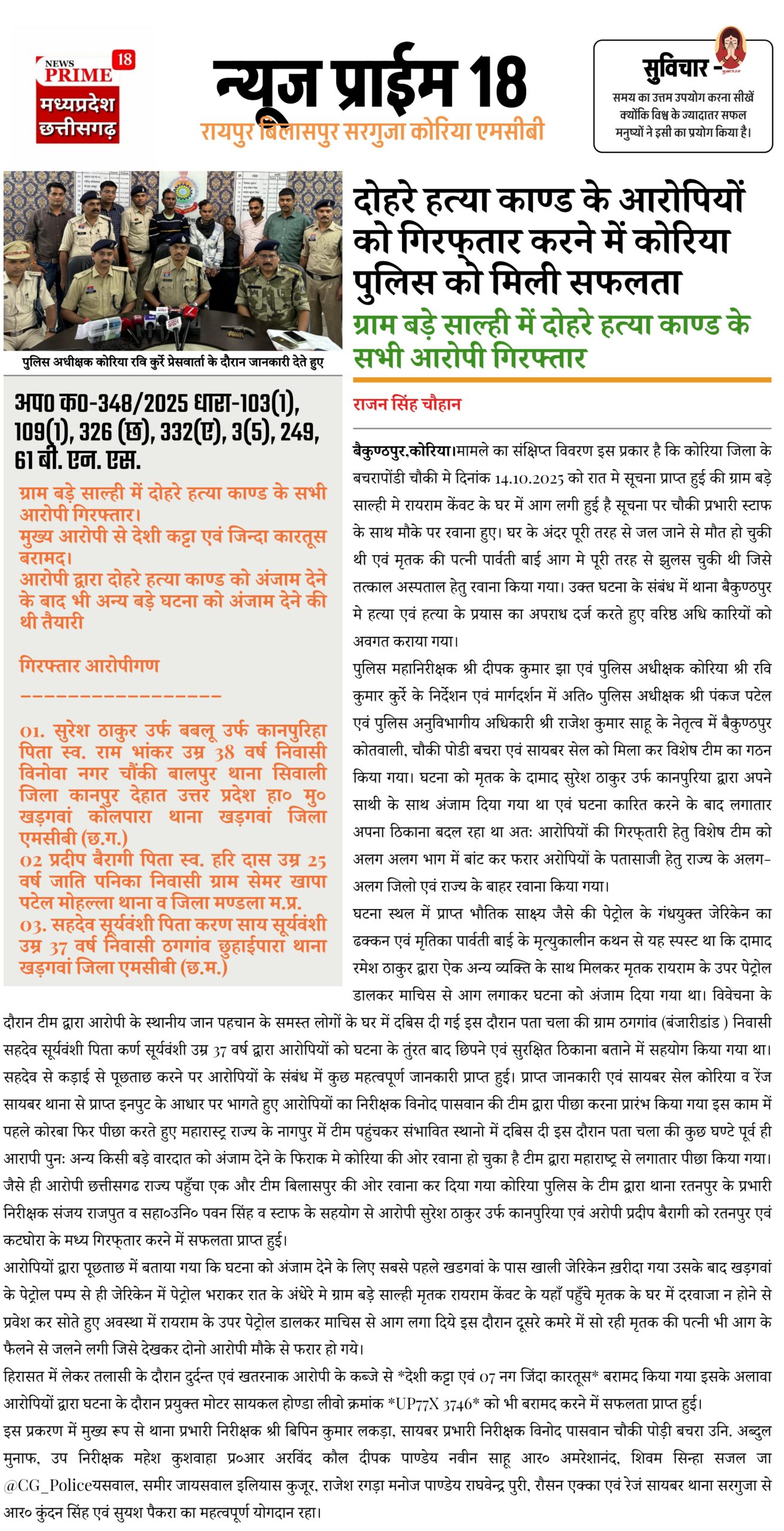 दोहरे हत्या काण्ड के आरोपियों को गिरफ्तार करने में कोरिया पुलिस को मिली सफलता