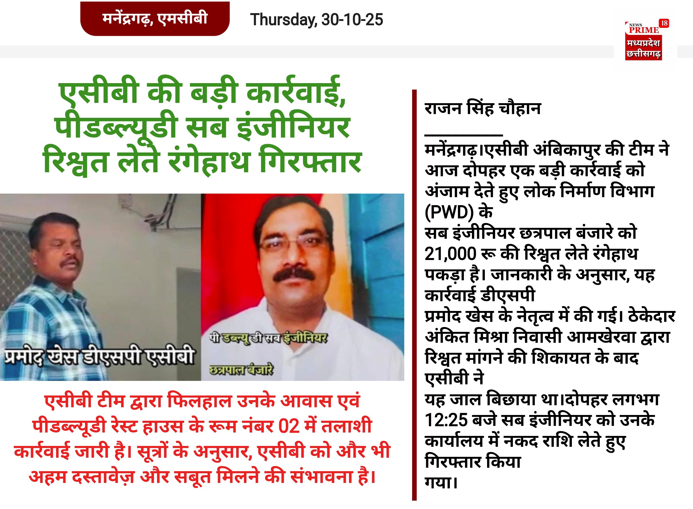 मनेंद्रगढ़।एसीबी अंबिकापुर की टीम ने आज दोपहर एक बड़ी कार्रवाई को अंजाम देते हुए लोक निर्माण विभाग (PWD) के सब इंजीनियर छत्रपाल बंजारे को 21,000 रू की रिश्वत लेते रंगेहाथ पकड़ा है। जानकारी के अनुसार, यह कार्रवाई डीएसपी प्रमोद खेस के नेतृत्व में की गई। ठेकेदार अंकित मिश्रा निवासी आमखेरवा द्वारा रिश्वत मांगने की शिकायत के बाद एसीबी ने यह जाल बिछाया था।दोपहर लगभग 12:25 बजे सब इंजीनियर को उनके कार्यालय में नकद राशि लेते हुए गिरफ्तार किया गया।एसीबी टीम द्वारा फिलहाल उनके आवास एवं पीडब्ल्यूडी रेस्ट हाउस के रूम नंबर 02 में तलाशी कार्रवाई जारी है। सूत्रों के अनुसार, एसीबी को और भी अहम दस्तावेज़ और सबूत मिलने की संभावना है।