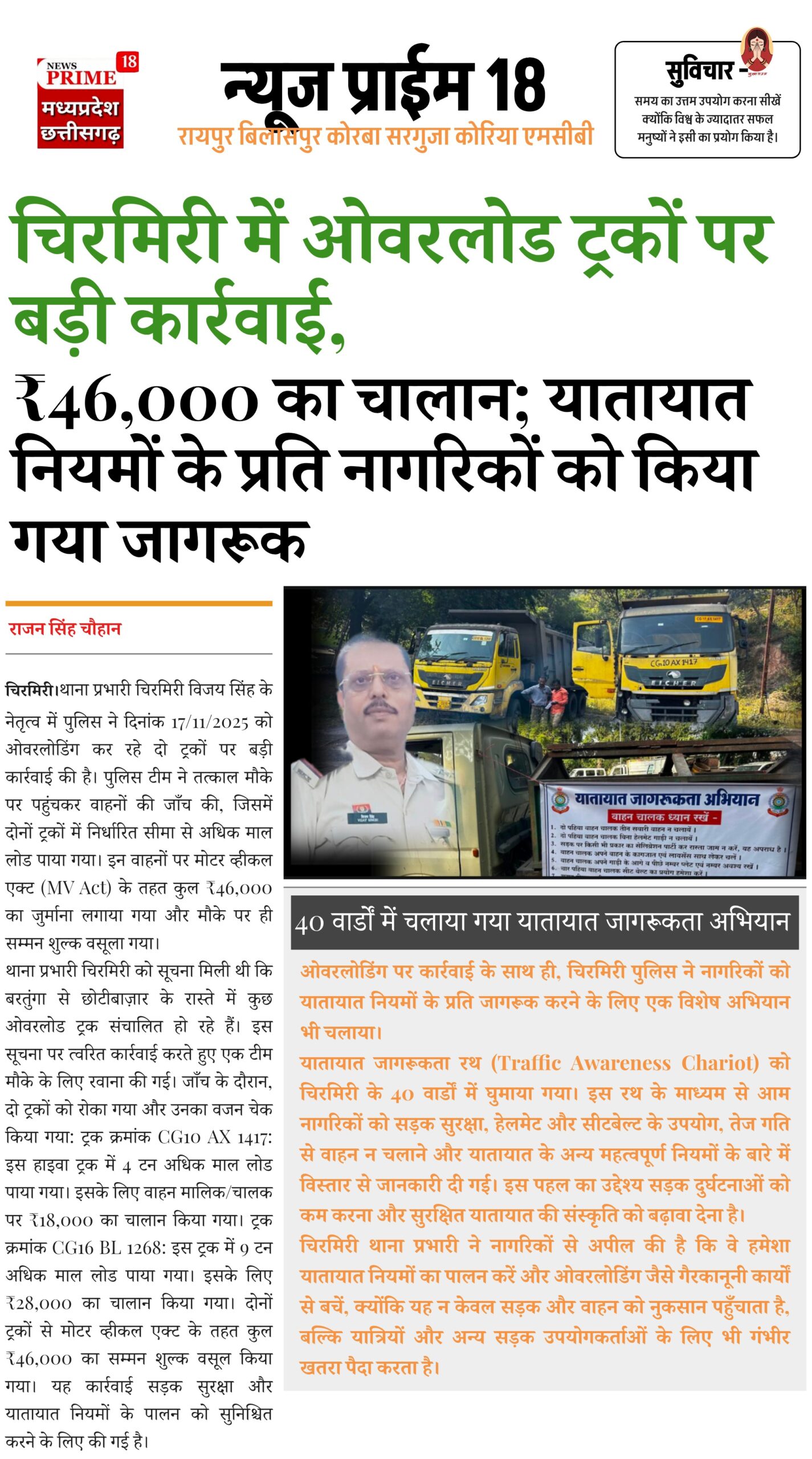 चिरमिरी, (दिनांक 18/11/2025)। थाना प्रभारी चिरमिरी विजय सिंह के नेतृत्व में पुलिस ने दिनांक 17/11/2025 को ओवरलोडिंग कर रहे दो ट्रकों पर बड़ी कार्रवाई की है। पुलिस टीम ने तत्काल मौके पर पहुंचकर वाहनों की जाँच की, जिसमें दोनों ट्रकों में निर्धारित सीमा से अधिक माल लोड पाया गया। इन वाहनों पर मोटर व्हीकल एक्ट (MV Act) के तहत कुल ₹46,000 का जुर्माना लगाया गया और मौके पर ही सम्मन शुल्क वसूला गया।