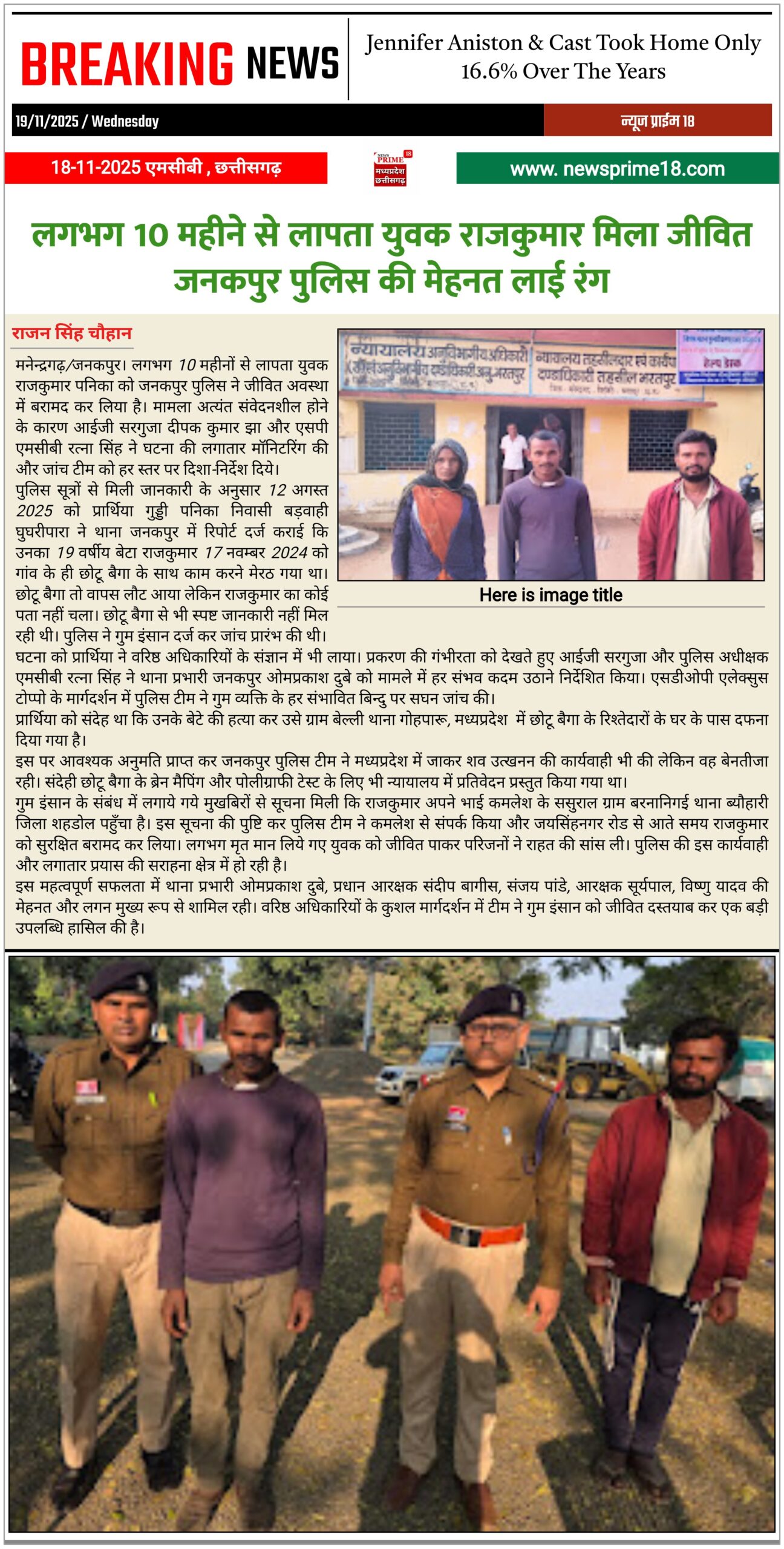 गुम इंसान के संबंध में लगाये गये मुखबिरों से सूचना मिली कि राजकुमार अपने भाई कमलेश के ससुराल ग्राम बरनानिगई थाना ब्यौहारी जिला शहडोल पहुँचा है। इस सूचना की पुष्टि कर पुलिस टीम ने कमलेश से संपर्क किया और जयसिंहनगर रोड से आते समय राजकुमार को सुरक्षित बरामद कर लिया। लगभग मृत मान लिये गए युवक को जीवित पाकर परिजनों ने राहत की सांस ली। पुलिस की इस कार्यवाही और लगातार प्रयास की सराहना क्षेत्र में हो रही है।
