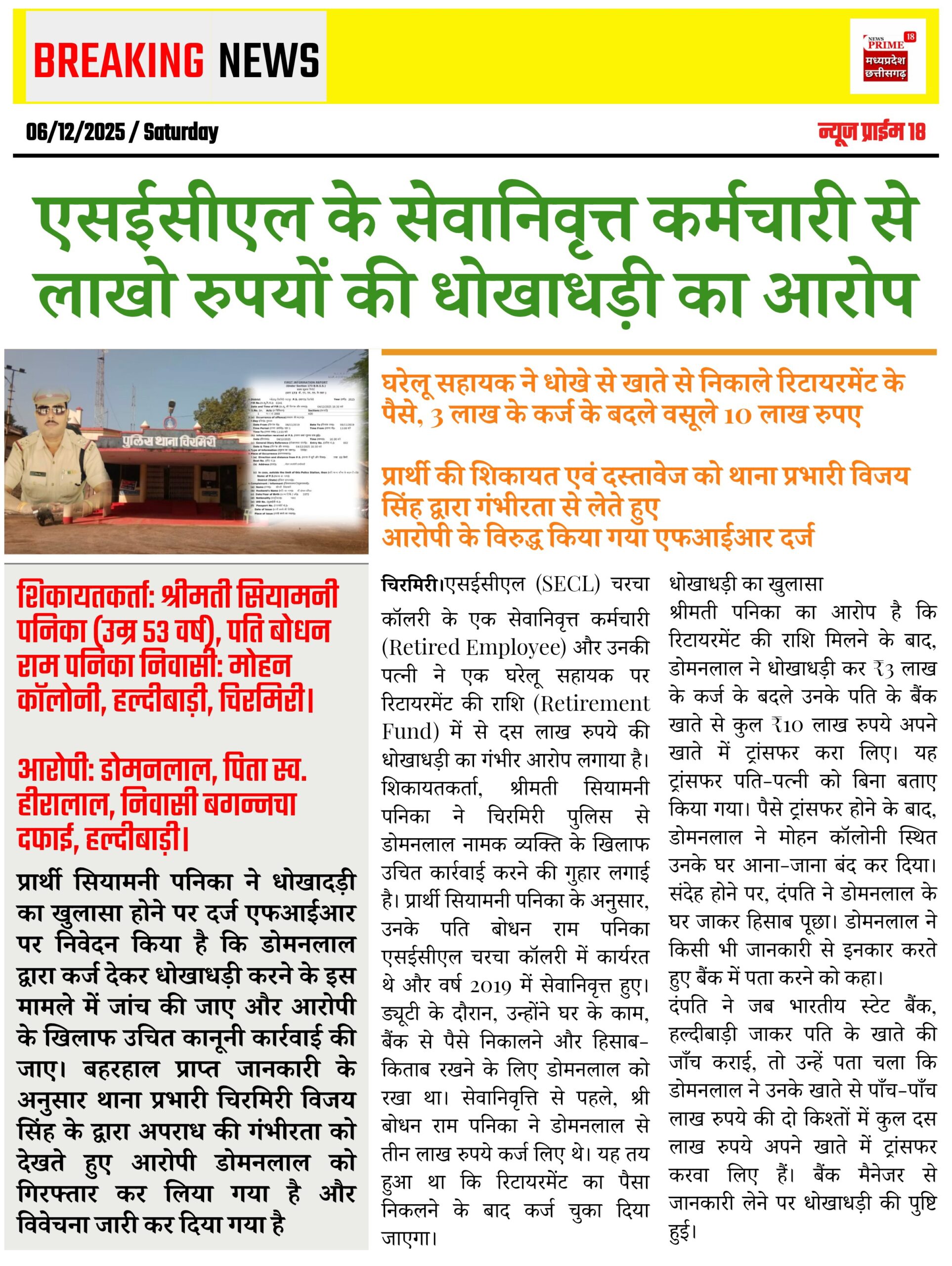 चिरमिरी,एमसीबी। एसईसीएल (SECL) चरचा कॉलरी के एक सेवानिवृत्त कर्मचारी (Retired Employee) और उनकी पत्नी ने एक घरेलू सहायक पर रिटायरमेंट की राशि (Retirement Fund) में से दस लाख रुपये की धोखाधड़ी का गंभीर आरोप लगाया है। शिकायतकर्ता, श्रीमती सियामनी पनिका ने चिरमिरी पुलिस से डोमनलाल नामक व्यक्ति के खिलाफ उचित कार्रवाई करने की गुहार लगाई है।