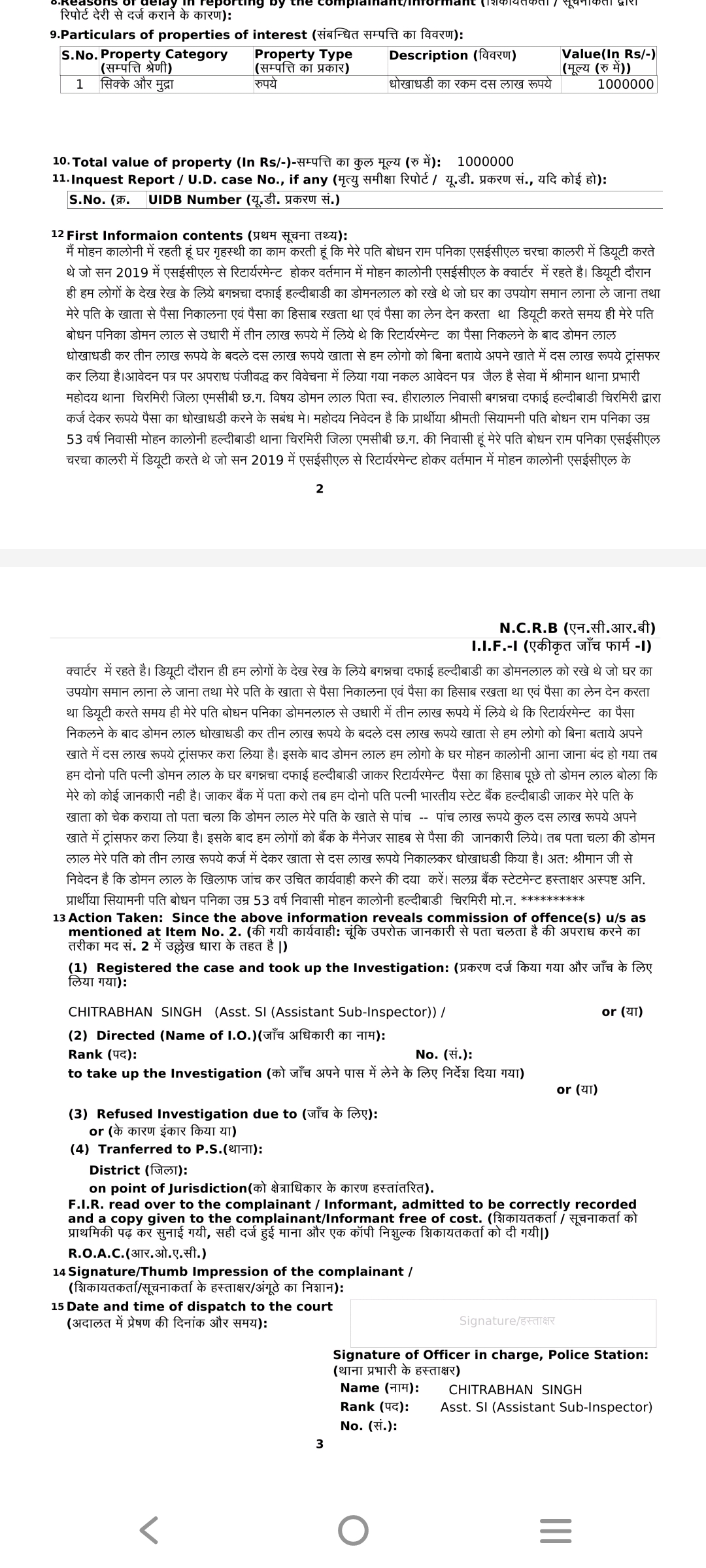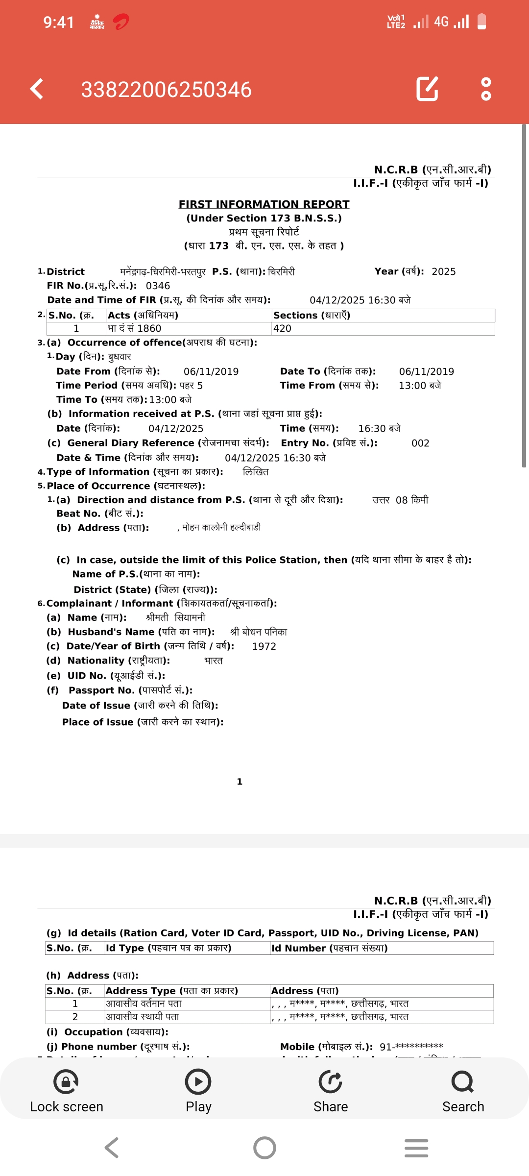 शिकायतकर्ता: सियामनी पनिका (उम्र 53 वर्ष), पति बोधन राम पनिका निवासी: मोहन कॉलोनी, हल्दीबाड़ी, चिरमिरी।