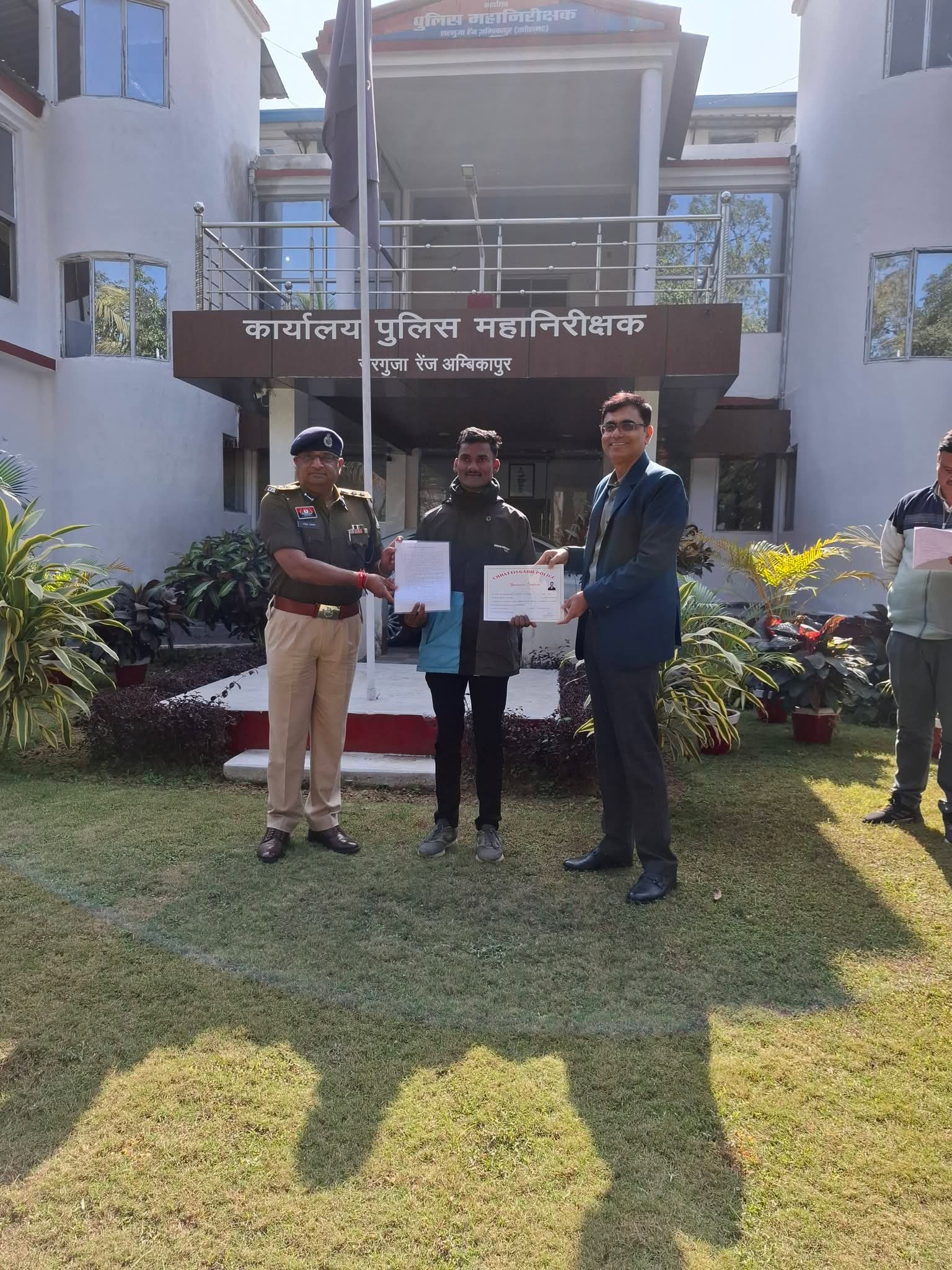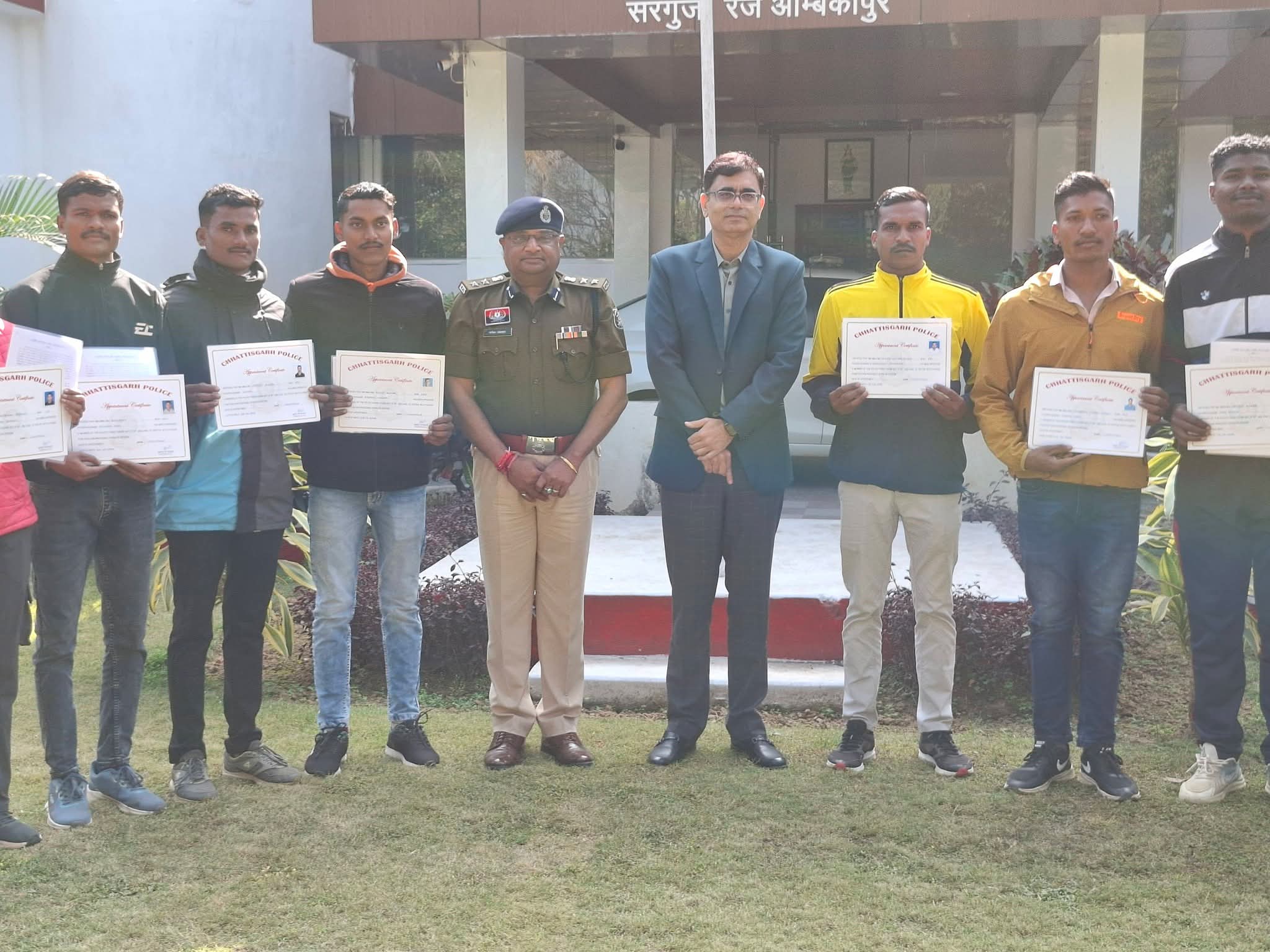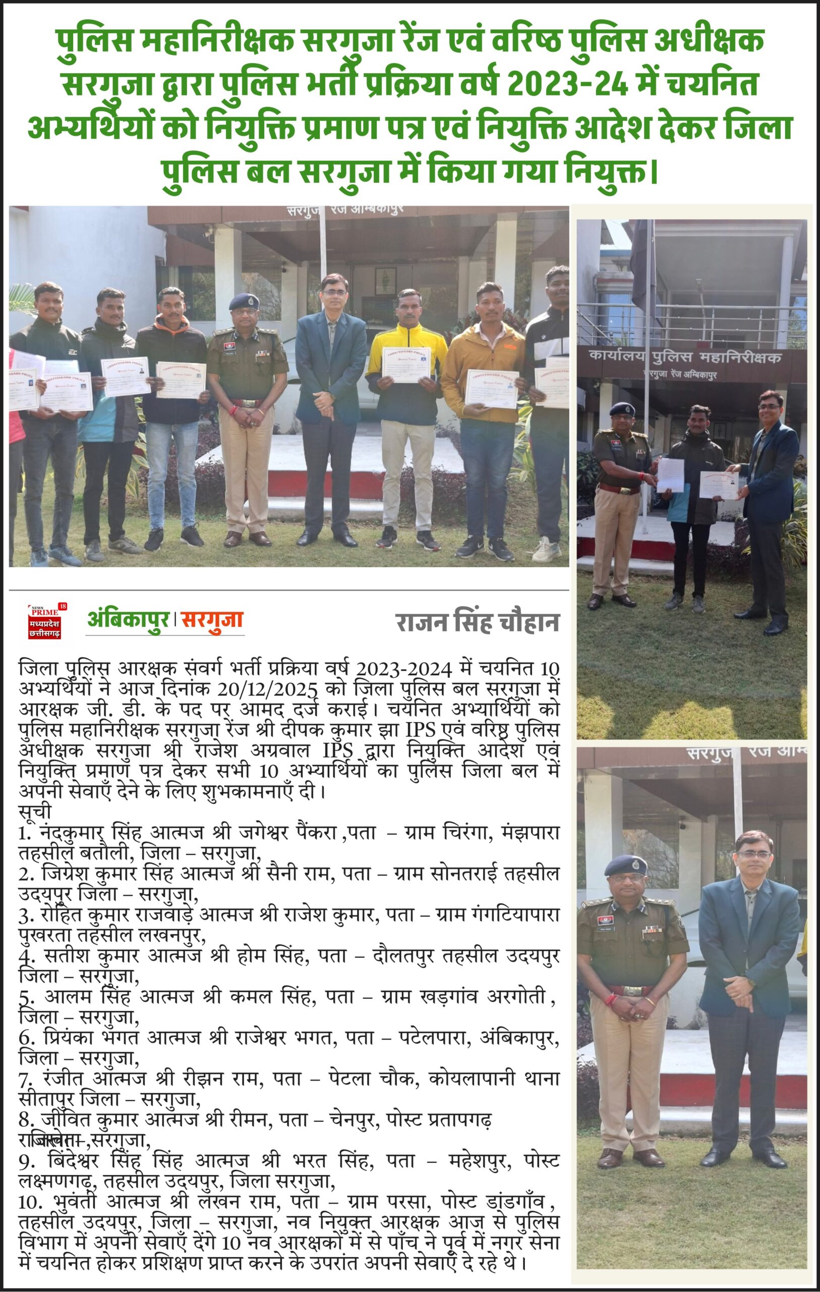 अंबिकापुर। जिला पुलिस आरक्षक संवर्ग भर्ती प्रक्रिया वर्ष 2023-2024 में चयनित 10 अभ्यर्थियों ने आज दिनांक 20/12/2025 को जिला पुलिस बल सरगुजा में आरक्षक जी. डी. के पद पर आमद दर्ज कराई। चयनित अभ्यार्थियों को पुलिस महानिरीक्षक सरगुजा रेंज श्री दीपक कुमार झा IPS एवं वरिष्ठ पुलिस अधीक्षक सरगुजा श्री राजेश अग्रवाल IPS द्वारा नियुक्ति आदेश एवं नियुक्ति प्रमाण पत्र देकर सभी 10 अभ्यार्थियों का पुलिस जिला बल में अपनी सेवाएँ देने के लिए शुभकामनाएँ दी।