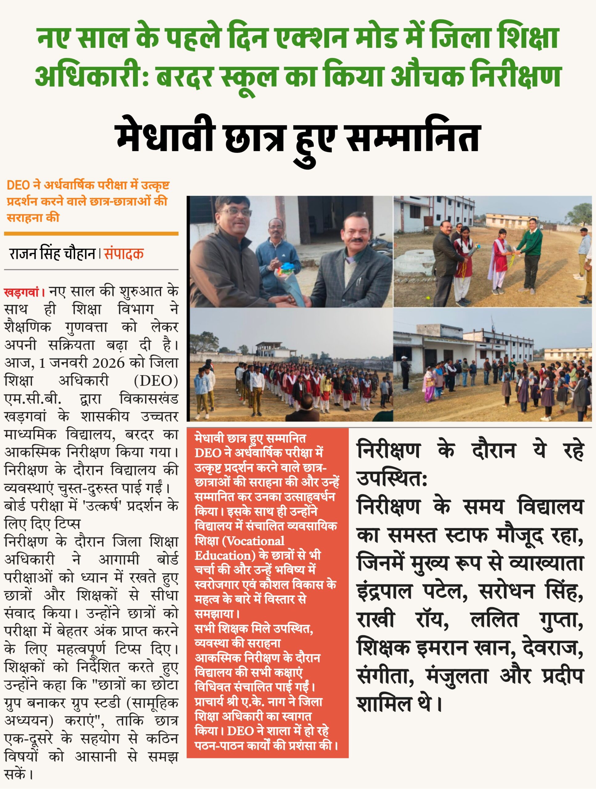 खड़गवां/बरदर। नए साल की शुरुआत के साथ ही शिक्षा विभाग ने शैक्षणिक गुणवत्ता को लेकर अपनी सक्रियता बढ़ा दी है। आज, 1 जनवरी 2026 को जिला शिक्षा अधिकारी (DEO) एम.सी.बी. द्वारा विकासखंड खड़गवां के शासकीय उच्चतर माध्यमिक विद्यालय, बरदर का आकस्मिक निरीक्षण किया गया। निरीक्षण के दौरान विद्यालय की व्यवस्थाएं चुस्त-दुरुस्त पाई गईं।