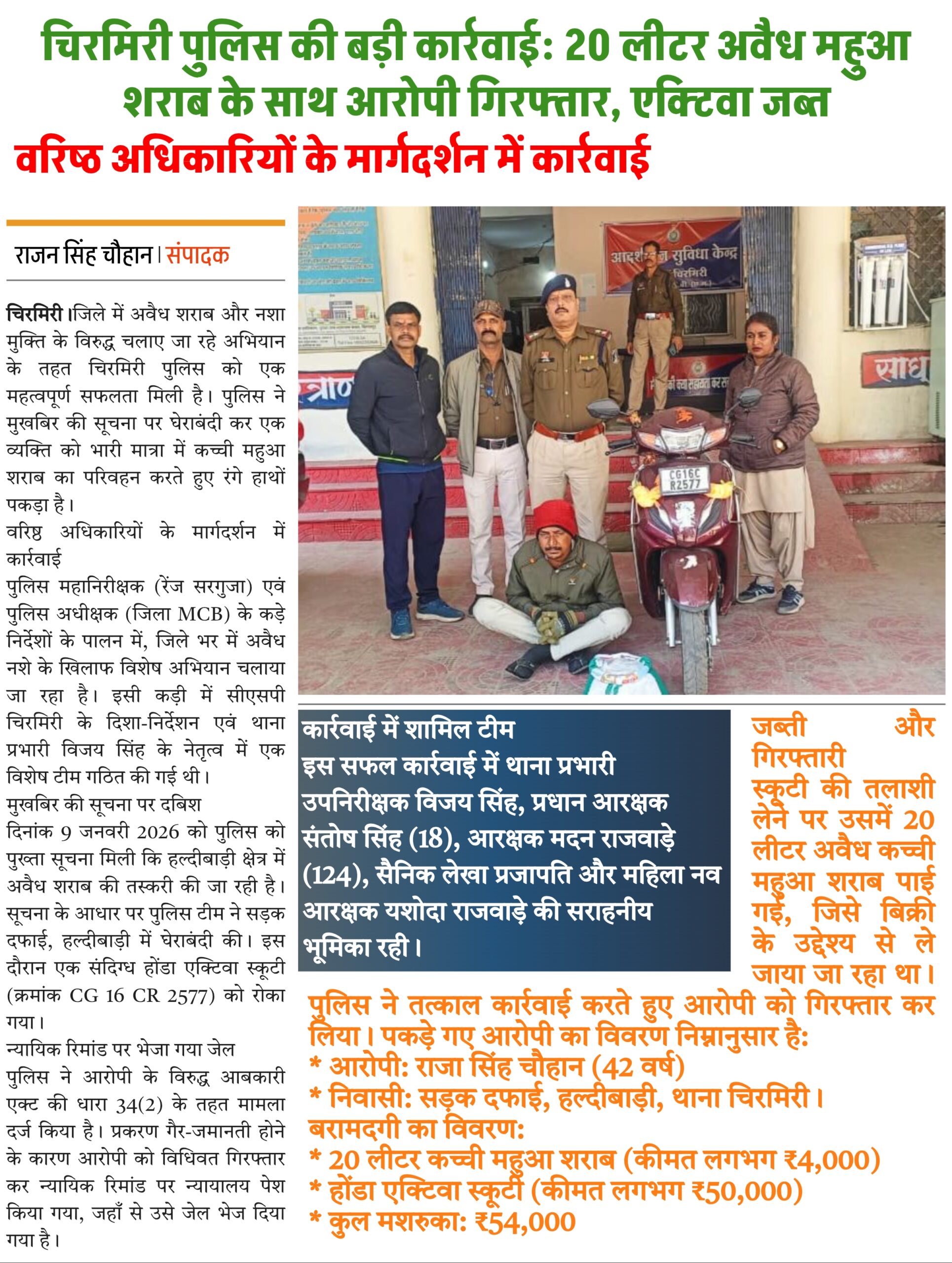 चिरमिरी पुलिस की बड़ी कार्रवाई: 20 लीटर अवैध महुआ शराब के साथ आरोपी गिरफ्तार, एक्टिवा जब्त