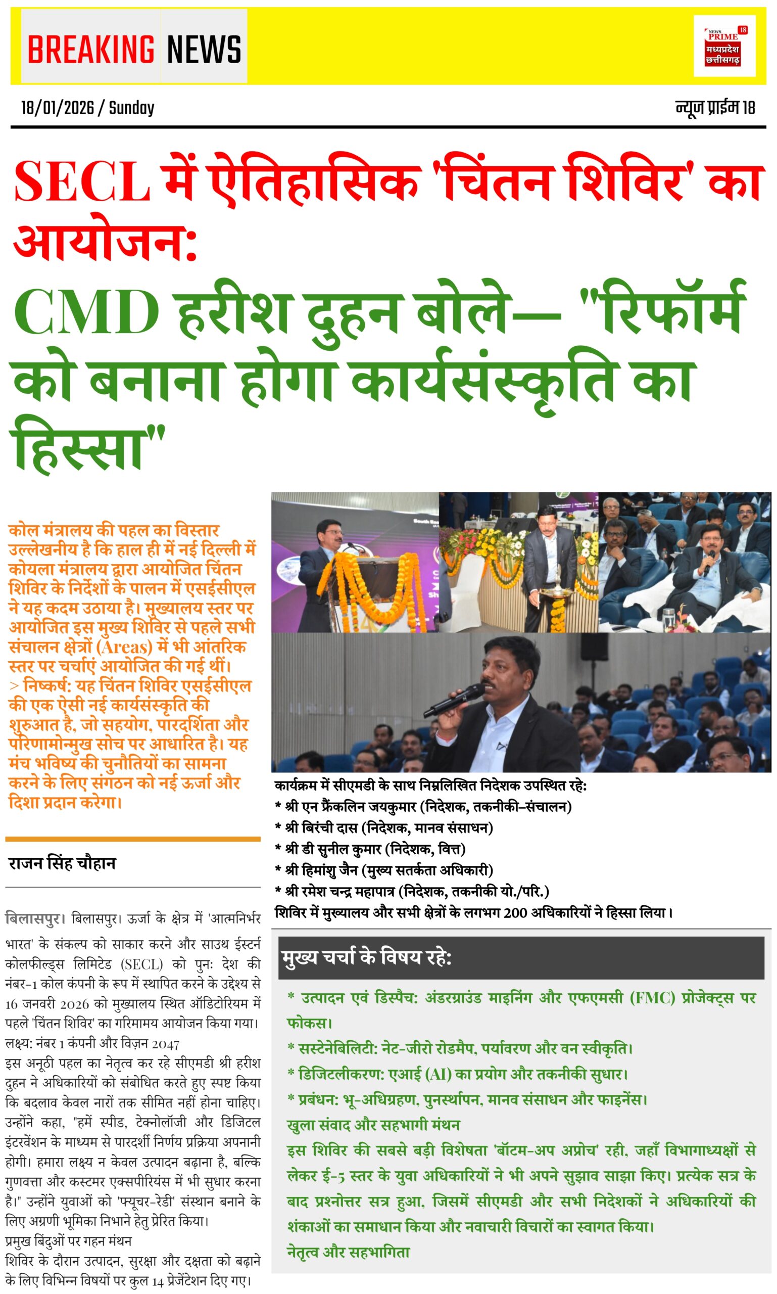 निष्कर्ष: यह चिंतन शिविर एसईसीएल की एक ऐसी नई कार्यसंस्कृति की शुरुआत है, जो सहयोग, पारदर्शिता और परिणामोन्मुख सोच पर आधारित है। यह मंच भविष्य की चुनौतियों का सामना करने के लिए संगठन को नई ऊर्जा और दिशा प्रदान करेगा।