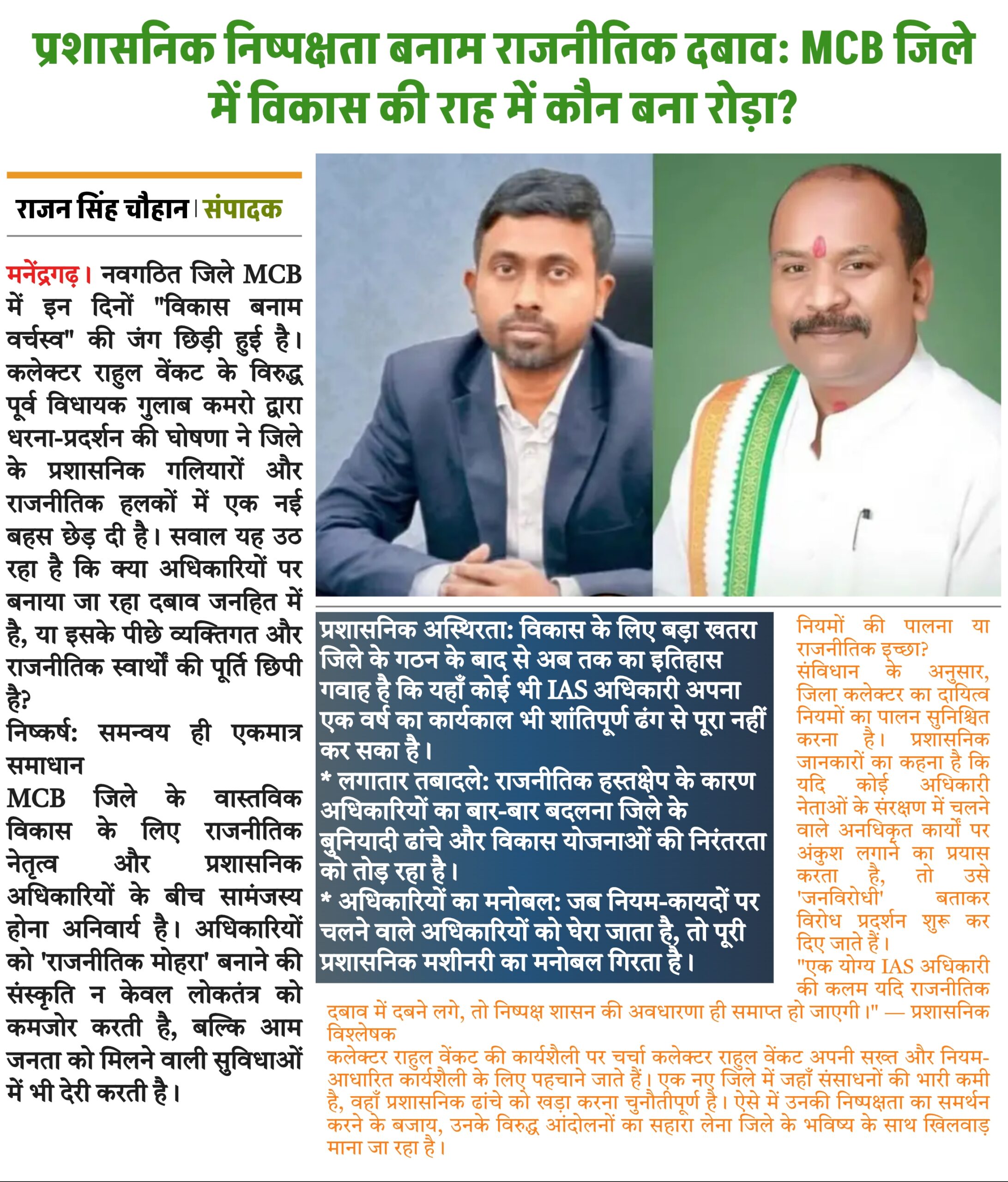 मनेन्द्रगढ़। नवगठित जिले MCB में इन दिनों “विकास बनाम वर्चस्व” की जंग छिड़ी हुई है। कलेक्टर राहुल वेंकट के विरुद्ध पूर्व विधायक गुलाब कमरो द्वारा धरना-प्रदर्शन की घोषणा ने जिले के प्रशासनिक गलियारों और राजनीतिक हलकों में एक नई बहस छेड़ दी है। सवाल यह उठ रहा है कि क्या अधिकारियों पर बनाया जा रहा दबाव जनहित में है, या इसके पीछे व्यक्तिगत और राजनीतिक स्वार्थों की पूर्ति छिपी है?