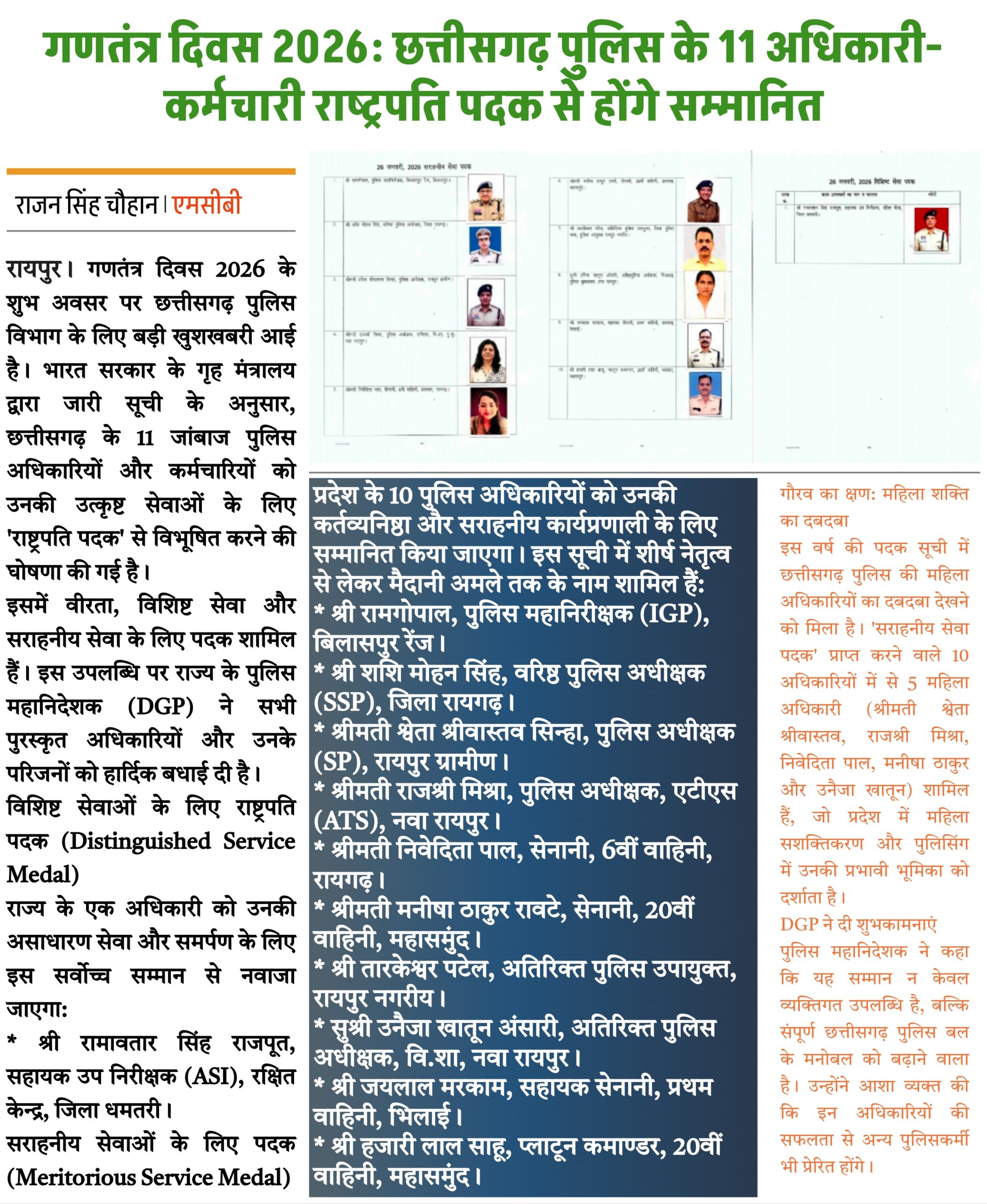 नवा रायपुर | गणतंत्र दिवस 2026 के शुभ अवसर पर छत्तीसगढ़ पुलिस विभाग के लिए बड़ी खुशखबरी आई है। भारत सरकार के गृह मंत्रालय द्वारा जारी सूची के अनुसार, छत्तीसगढ़ के 11 जांबाज पुलिस अधिकारियों और कर्मचारियों को उनकी उत्कृष्ट सेवाओं के लिए ‘राष्ट्रपति पदक’ से विभूषित करने की घोषणा की गई है।