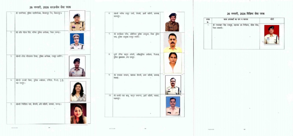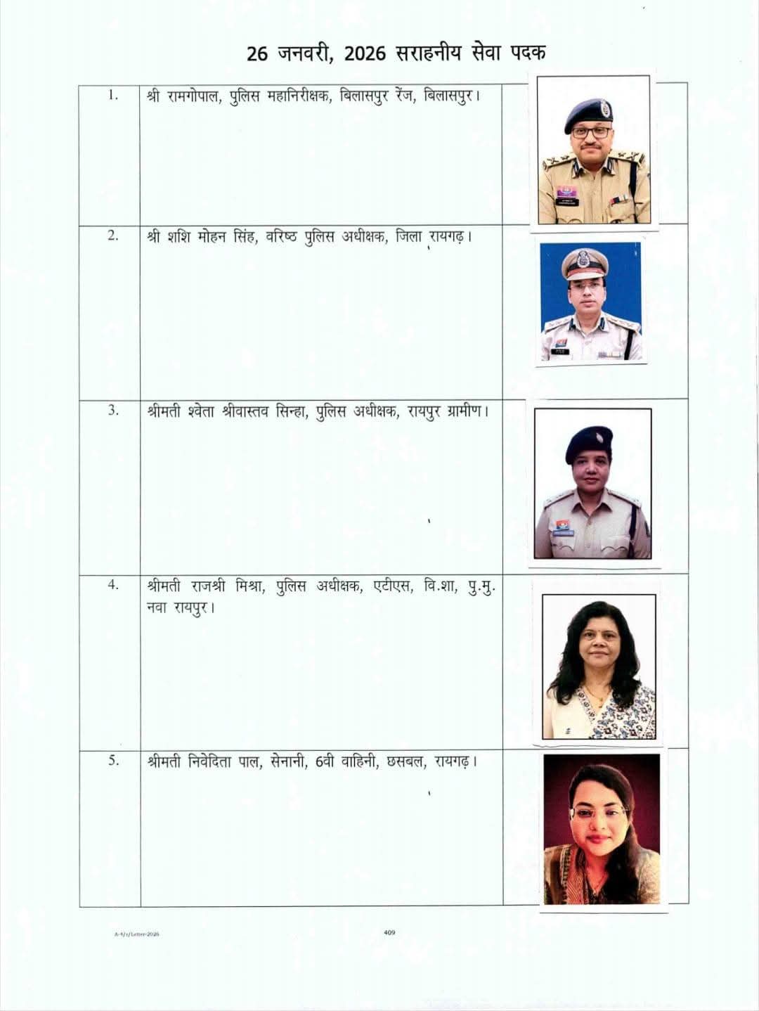 इस वर्ष की पदक सूची में छत्तीसगढ़ पुलिस की महिला अधिकारियों का दबदबा देखने को मिला है। ‘सराहनीय सेवा पदक’ प्राप्त करने वाले 10 अधिकारियों में से 5 महिला अधिकारी (श्रीमती श्वेता श्रीवास्तव, राजश्री मिश्रा, निवेदिता पाल, मनीषा ठाकुर और उनैजा खातून) शामिल हैं, जो प्रदेश में महिला सशक्तिकरण और पुलिसिंग में उनकी प्रभावी भूमिका को दर्शाता है।