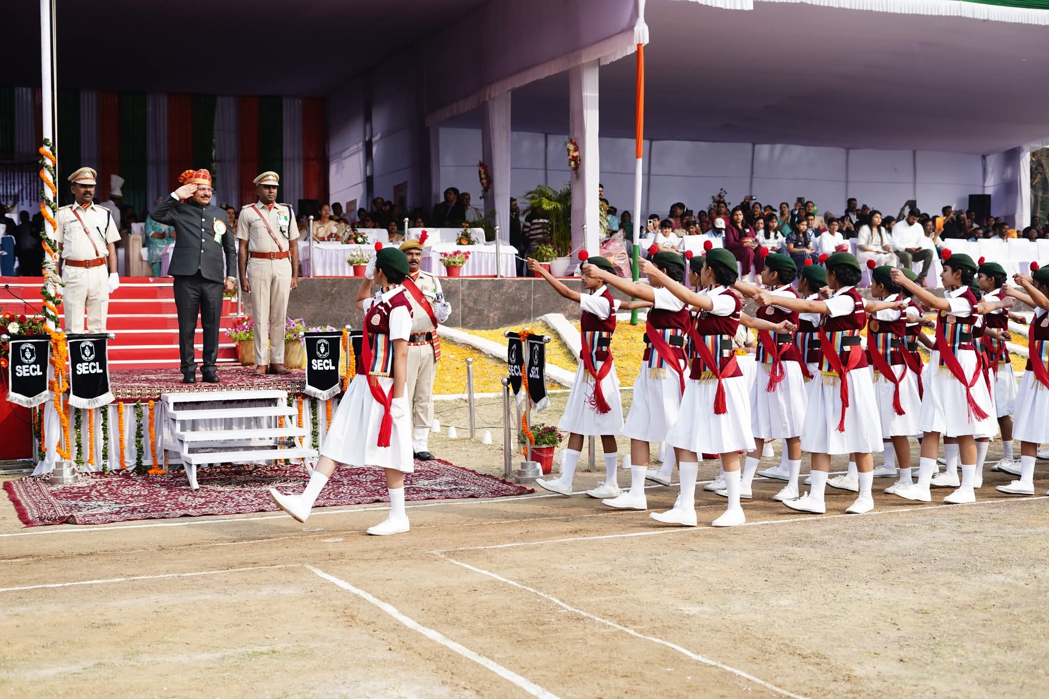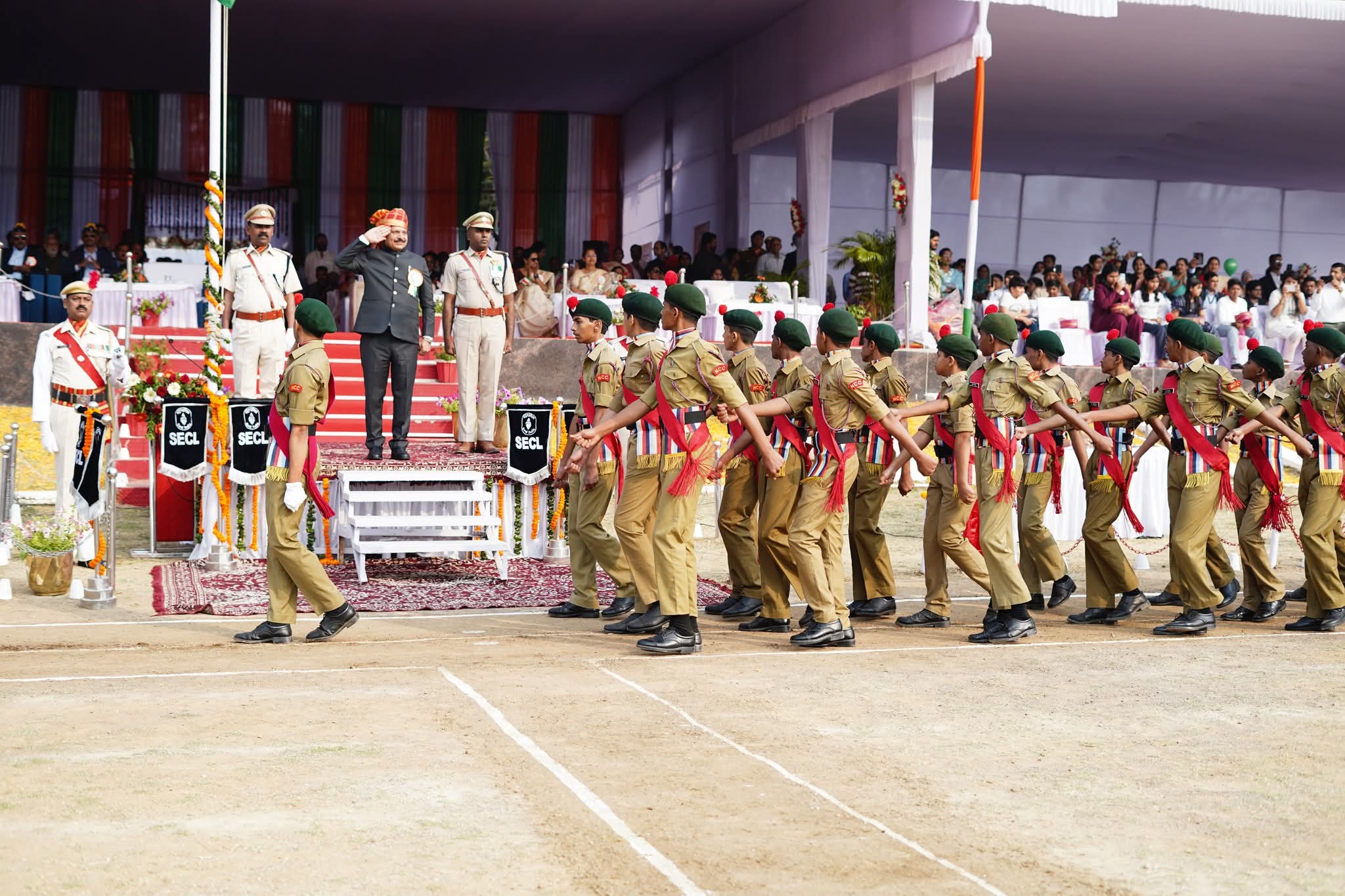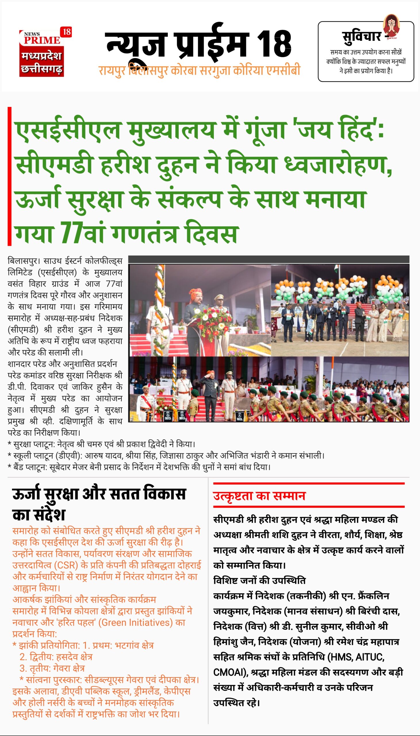 बिलासपुर। साउथ ईस्टर्न कोलफील्ड्स लिमिटेड (एसईसीएल) के मुख्यालय वसंत विहार ग्राउंड में आज 77वां गणतंत्र दिवस पूरे गौरव और अनुशासन के साथ मनाया गया। इस गरिमामय समारोह में अध्यक्ष-सह-प्रबंध निदेशक (सीएमडी) श्री हरीश दुहन ने मुख्य अतिथि के रूप में राष्ट्रीय ध्वज फहराया और परेड की सलामी ली।