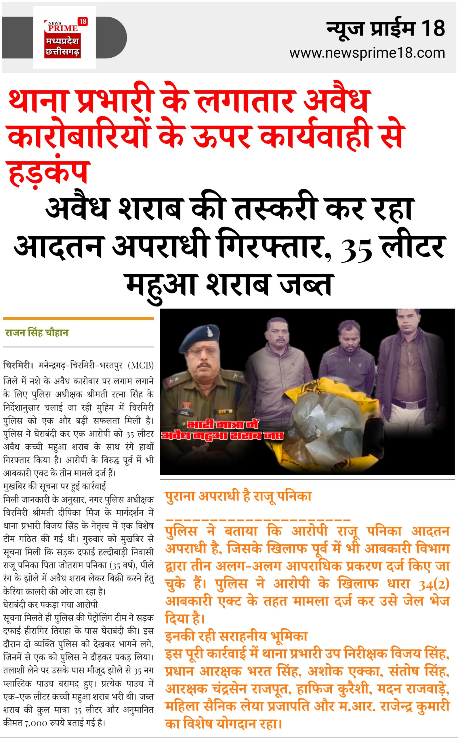 चिरमिरी। मनेन्द्रगढ़-चिरमिरी-भरतपुर (MCB) जिले में नशे के अवैध कारोबार पर लगाम लगाने के लिए पुलिस अधीक्षक श्रीमती रत्ना सिंह के निर्देशानुसार चलाई जा रही मुहिम में चिरमिरी पुलिस को एक और बड़ी सफलता मिली है। पुलिस ने घेराबंदी कर एक आरोपी को 35 लीटर अवैध कच्ची महुआ शराब के साथ रंगे हाथों गिरफ्तार किया है। आरोपी के विरुद्ध पूर्व में भी आबकारी एक्ट के तीन मामले दर्ज हैं।