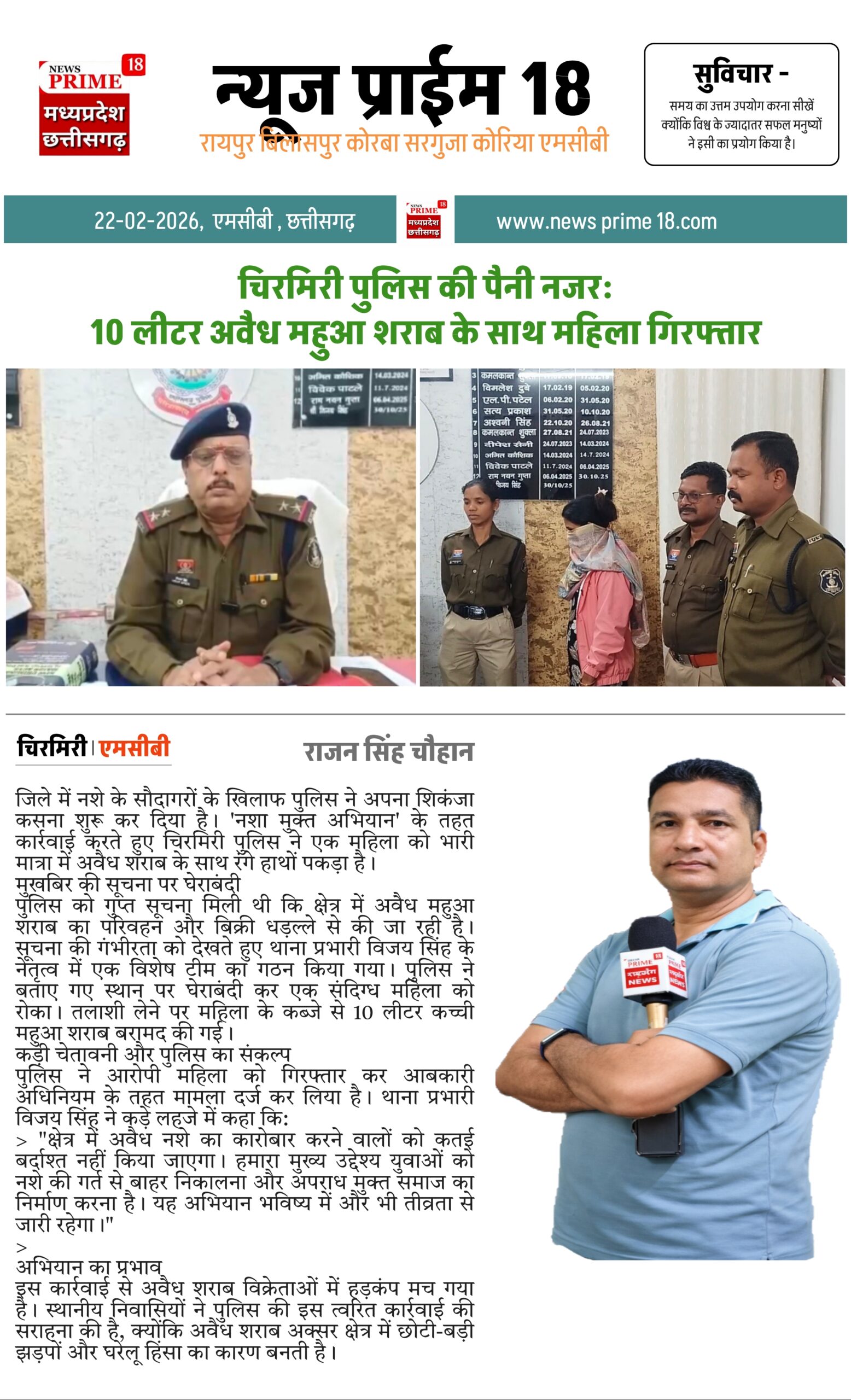 चिरमिरी। मनेन्द्रगढ़-भरतपुर-चिरमिरी (MCB) जिले में नशे के सौदागरों के खिलाफ पुलिस ने अपना शिकंजा कसना शुरू कर दिया है। ‘नशा मुक्त अभियान’ के तहत कार्रवाई करते हुए चिरमिरी पुलिस ने एक महिला को भारी मात्रा में अवैध शराब के साथ रंगे हाथों पकड़ा है।